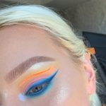 With a fine liner brush and Suva Beauty’s Hydra FX in Cherry Bomb, create a large outline of a wing. For the longer line, start on the inner corner of the eye, avoiding the crease, moving the colour out towards the brow. Start the second, shorter line at the outer corner of the eye and drag it out towards the brow to meet the first line.