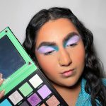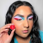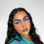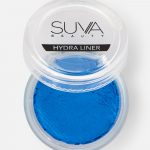 Blend your lilac and blue shadows down onto the lower lash line, then take a second coloured eyeliner, we’re using Suva’s Hydra Liner in Blue Steel and use draw on symmetrical dots to the face, above the brow and below your wing.